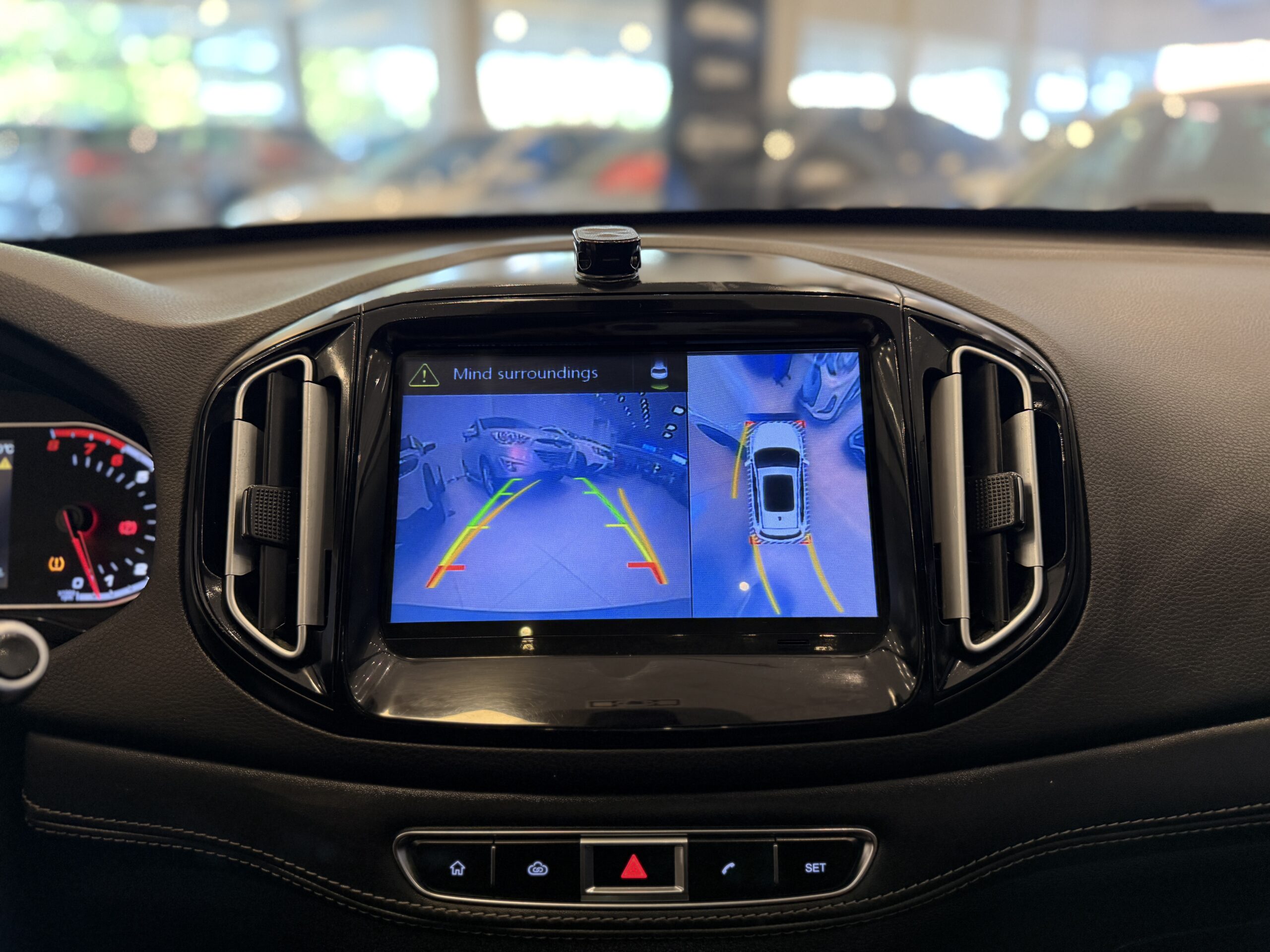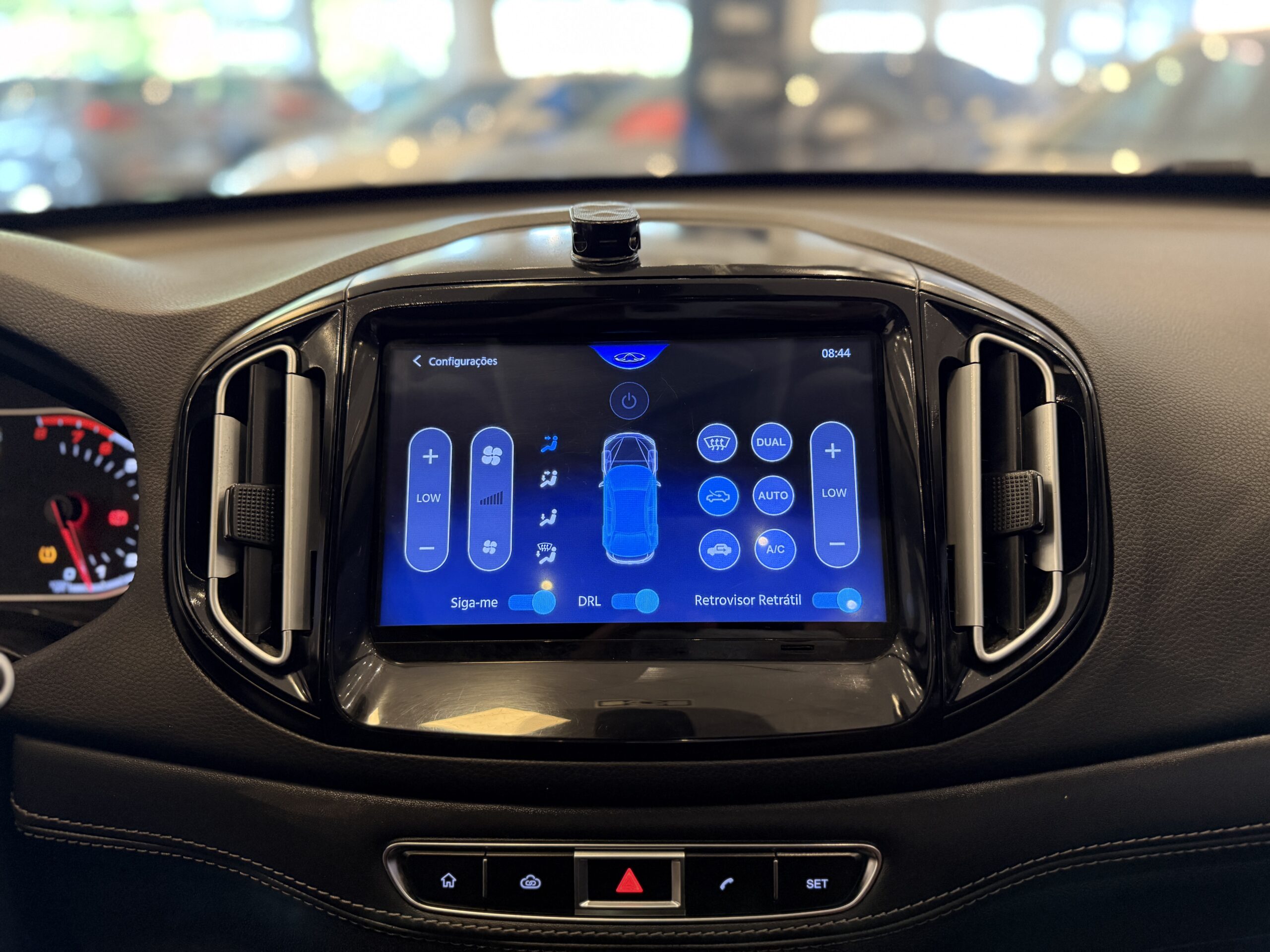 A central multimídia de 9 polegadas é o centro de controle do carro. Ela oferece conectividade com Apple CarPlay e Android Auto (via cabo). Um diferencial interessante é o sistema de câmeras 360 graus. A imagem projetada na tela ajuda significativamente em manobras de estacionamento em locais apertados, permitindo visualizar obstáculos ao redor de todo o veículo. Além disso, o carro conta com freio de estacionamento eletrônico e função Auto Hold.