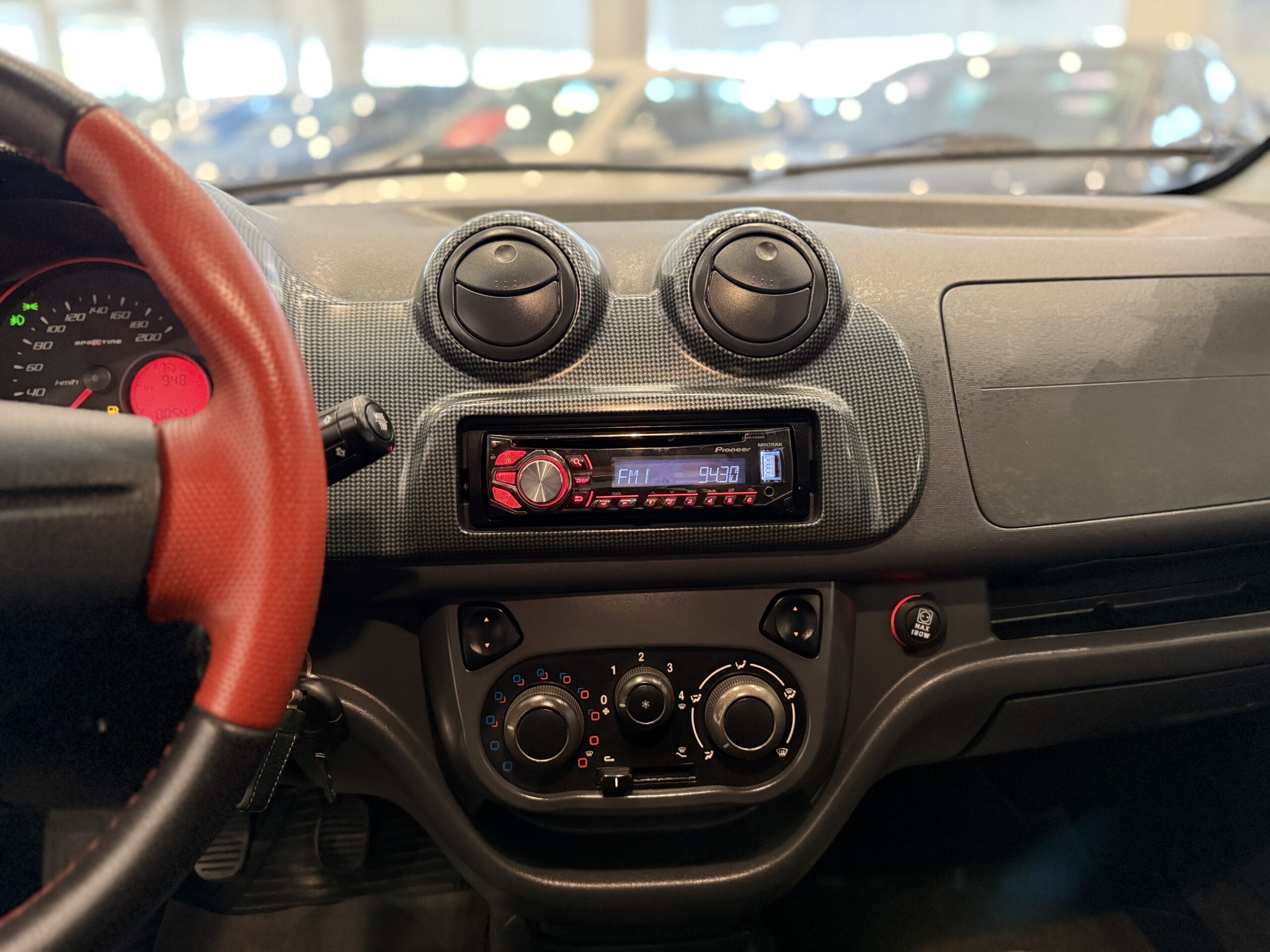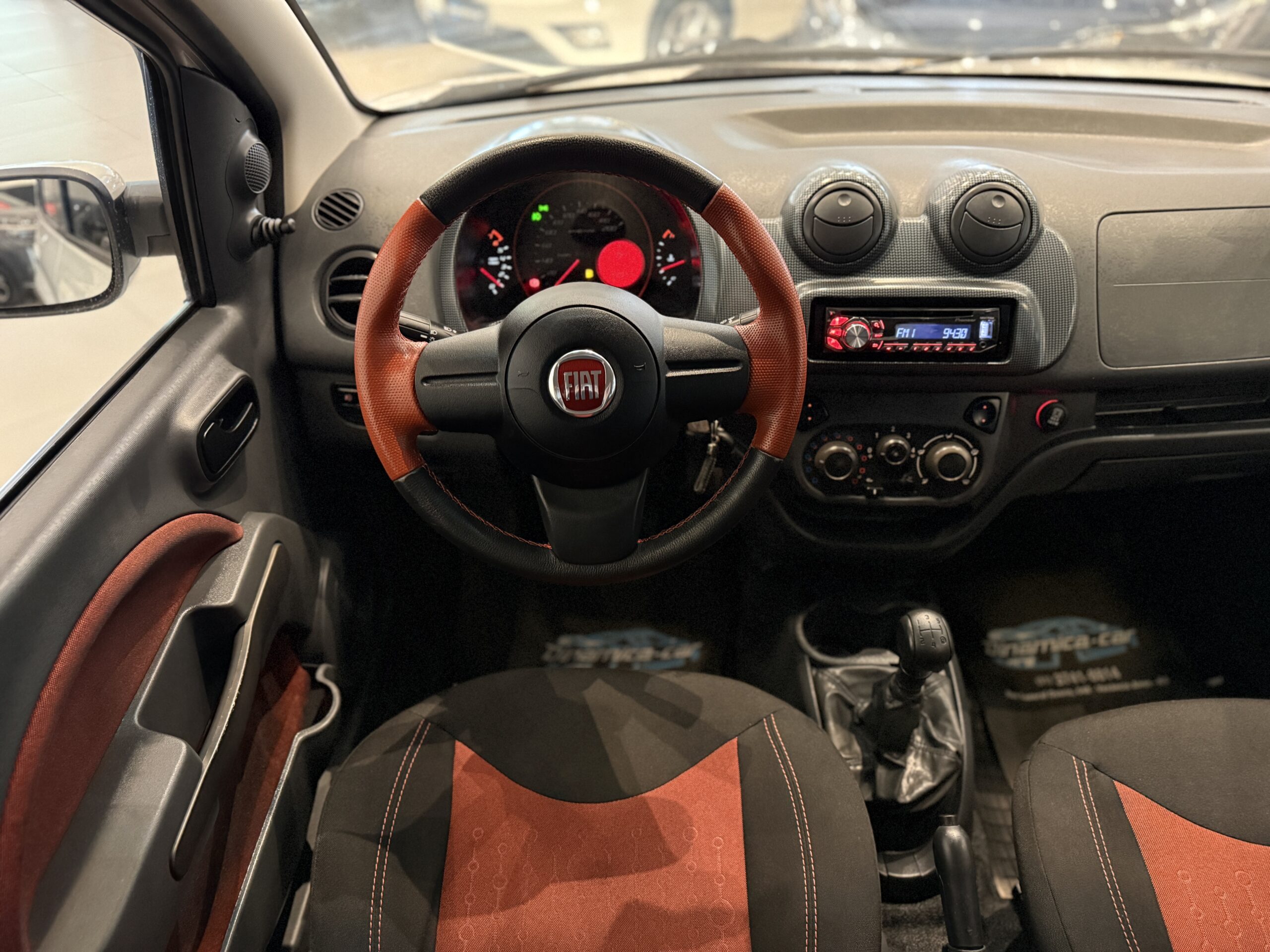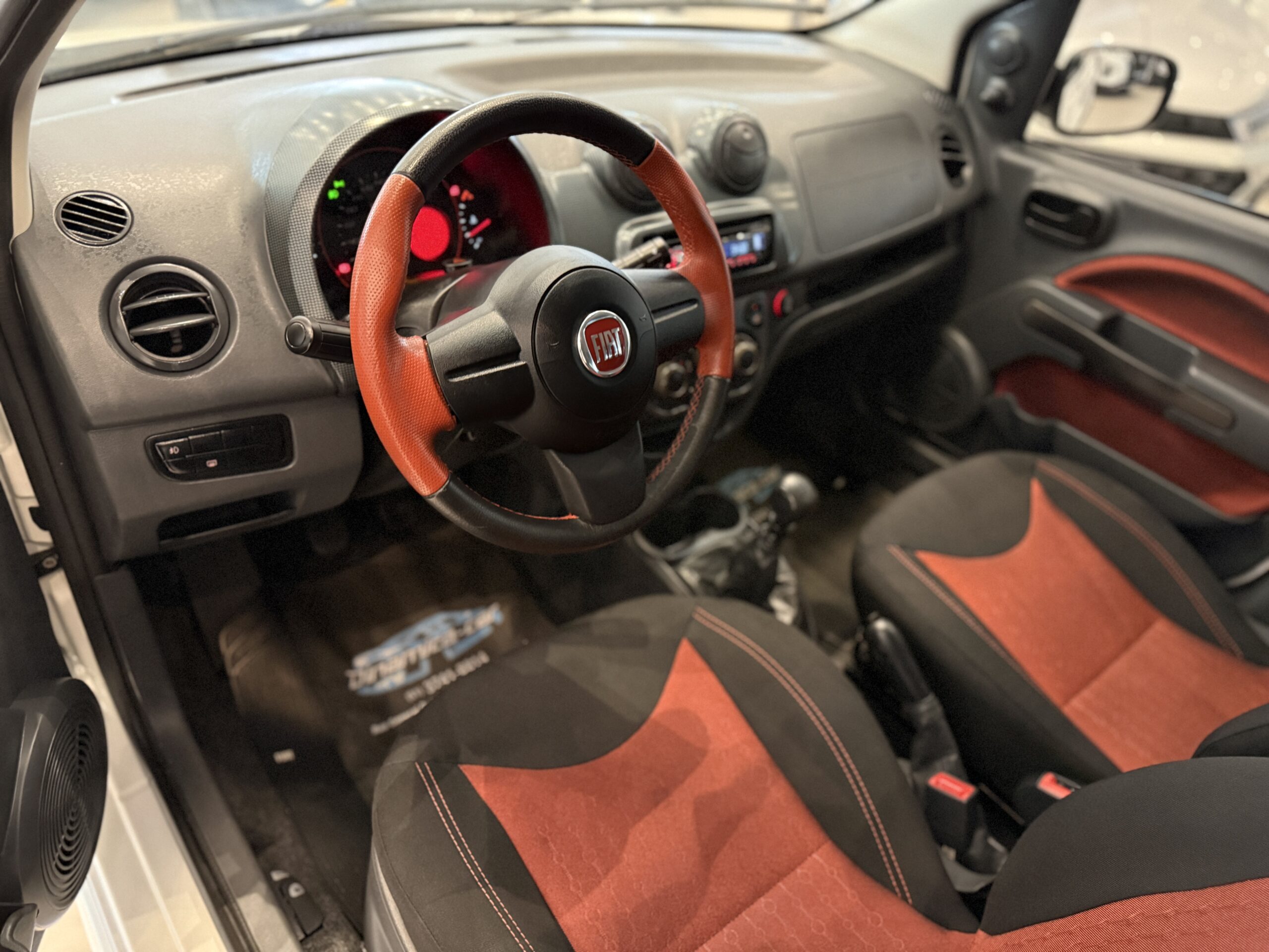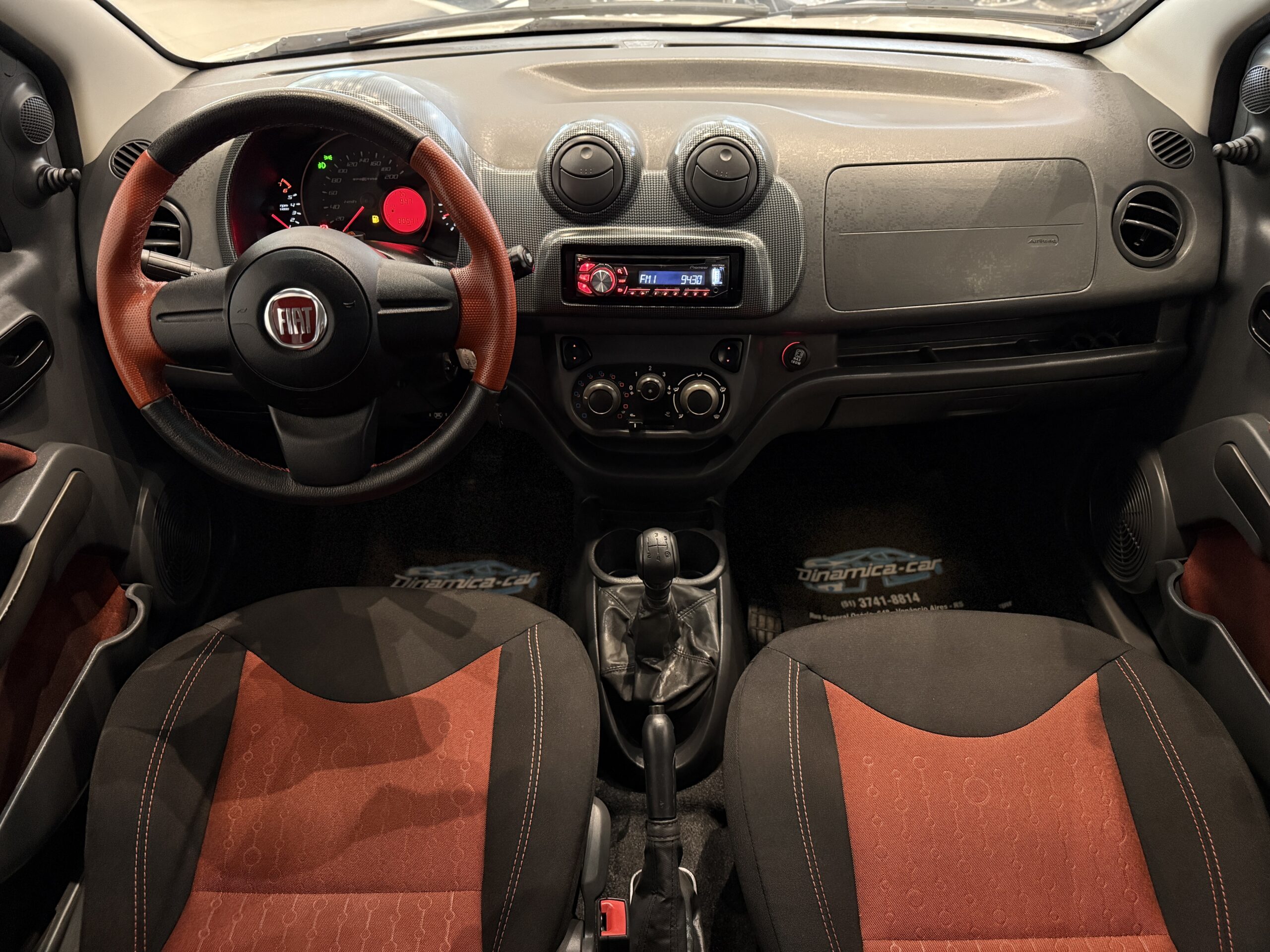 Por dentro, o Uno Sporting 2014 mantém o estilo ousado e moderno do exterior. O painel é bem característico, com formas geométricas e acabamento em duas cores, dependendo da configuração. O quadro de instrumentos tem grafismos exclusivos e iluminação âmbar, com detalhes em vermelho que remetem à esportividade. O volante, de três raios, possui base achatada e revestimento que melhora a pegada.